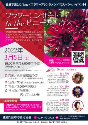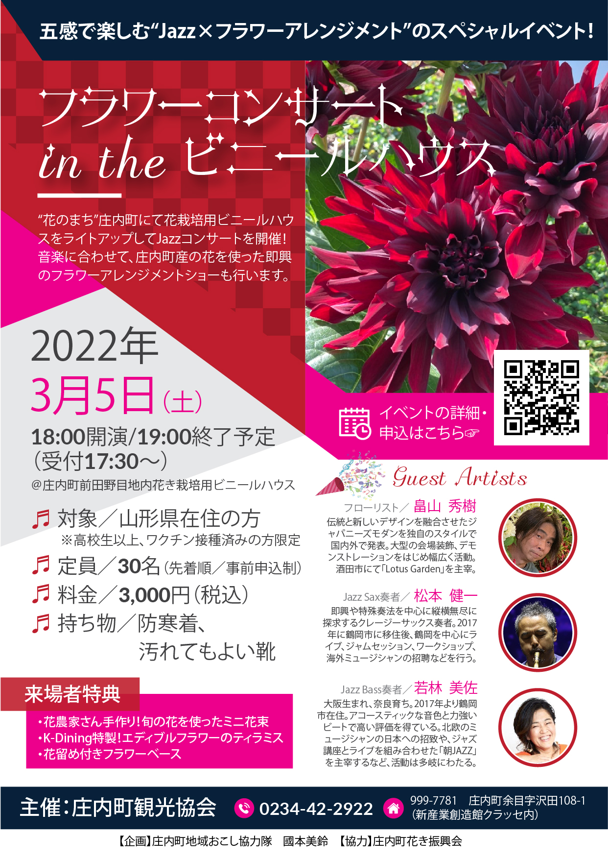 プロのJazz アーティストの生演奏に合わせて、人気フローリストによる庄内町産の花を使ったフラワーアレンジメントショーがお愉しみいただけます。