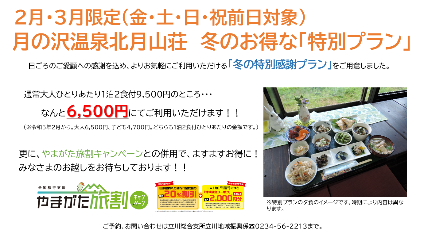 月の沢温泉北月山荘では、日頃のご愛顧への感謝といたしまして、2月、3月限定「冬の特別感謝プラン」をご用意いたしました。