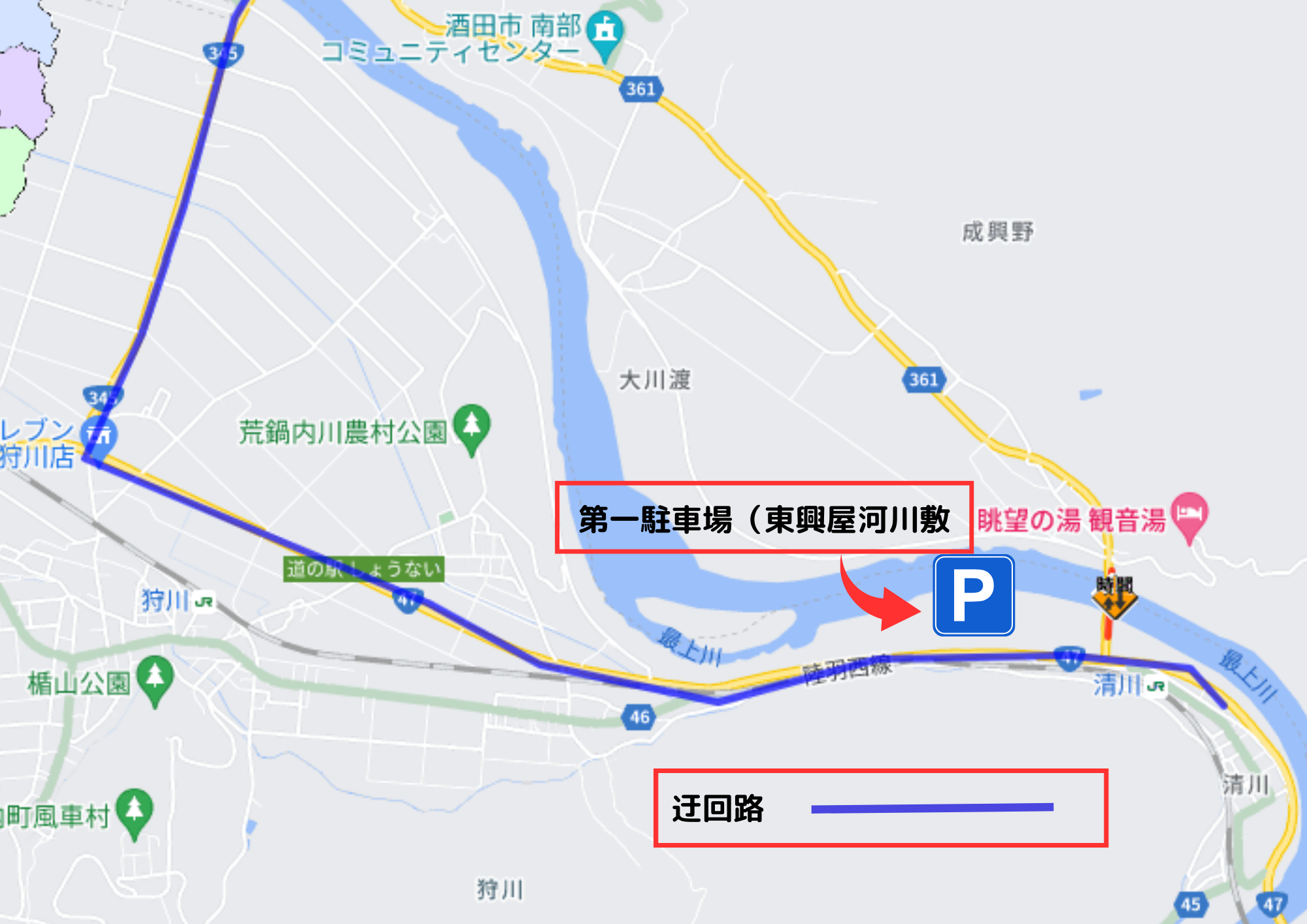 月山龍神マラソンからお帰りの際は、清川橋の迂回路としてセブンイレブン狩川店前の交差点を右折してください。