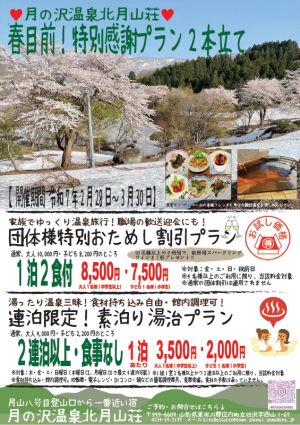 月の沢温泉北月山荘【期間限定】春目前!特別感謝プラン2本立て!