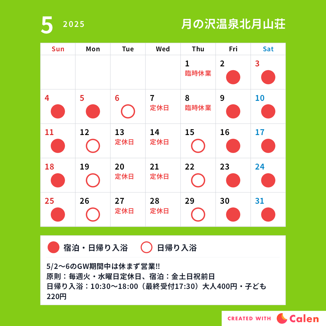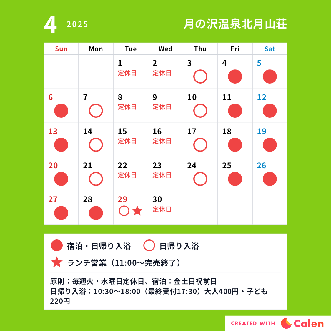 【月の沢温泉北月山荘】4月・5月の営業日について