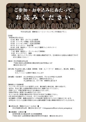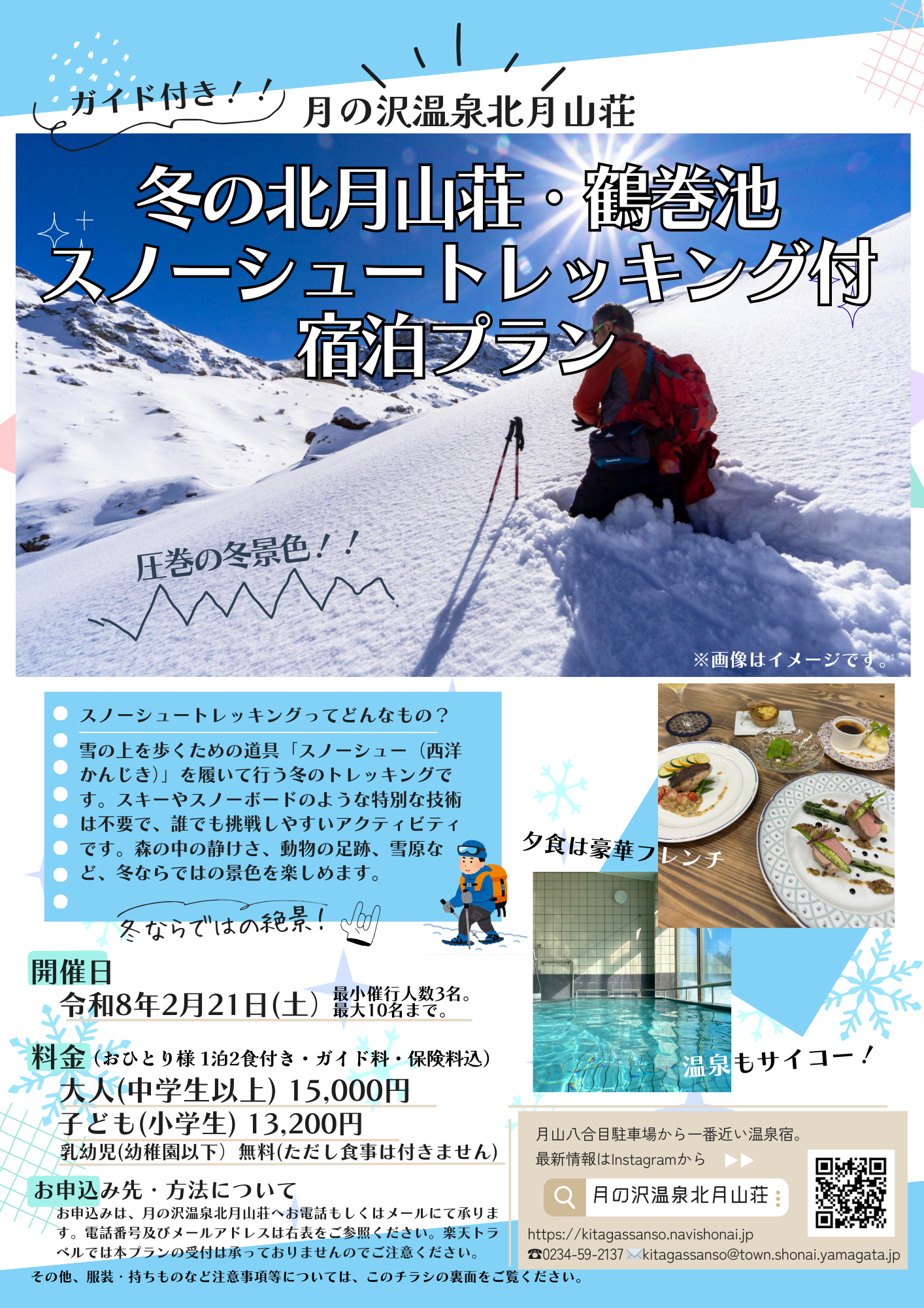R8.2.21開催【月の沢温泉北月山荘】冬の北月山荘・鶴巻池スノーシュートレッキング付宿泊プラン開催