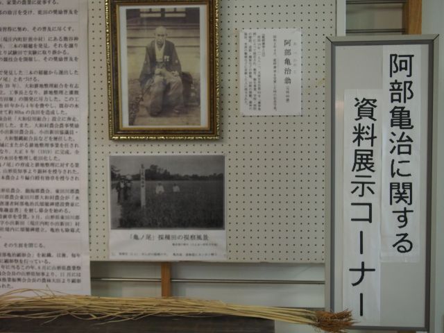 ササニシキやコシヒカリといった良質米のルーツとして名高い「亀ノ尾」を作り出した阿部亀治の功績をたたえ、農具・民具などの資料品を展示している。