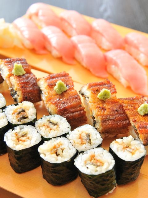 うなぎと酢飯との相性が抜群の「うなぎのにぎり」の他、甘みが違うマグロは築地のセリ場直送!